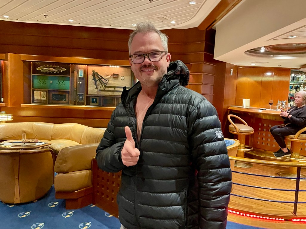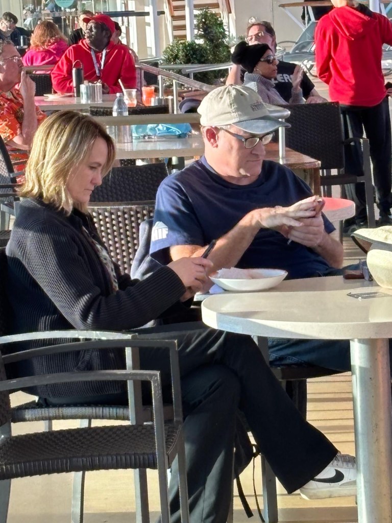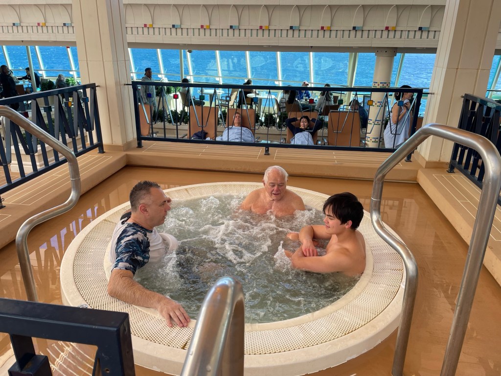 Kevin and I were prepared to find a cruise a bit cheesy, but we truly enjoyed it. It was such a nice mix of elegant—especially the nightly dining with a three-course meal served beautifully to us—and relaxed and engaging. We attended several trivia games; listened to live piano music (Beatles, jazz, Bruce Springsteen) in the Schooner’s Bar, or Shooner’s Bar, as Tatum called it; and read on the deck. There was an Enrico’s movie screen but it was too cold and windy at night for more than a hot tub run for me. The morning coffees there with the wide open ocean beside us were pretty glorious; it was a treat for Kevin and me to have unrushed quiet time together.