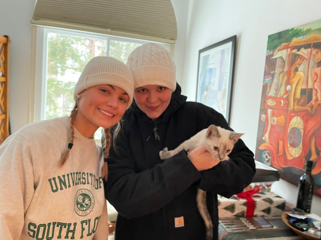 We have our USF merch around the house to make us feel closer and nothing sparkles more like Tatum than the beautiful champagne bottle she bedazzled for graduation. But we miss her. Luna the cat still wanders into the room looking for her and wanders out, sadly settling for my bed with practically an audible sigh.