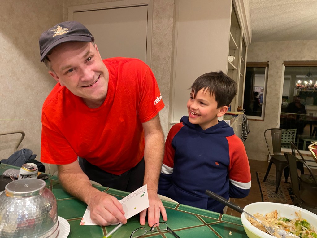 Mom/Joanna: Escaping from Finn burying my feet, watching Paul teach the kids to surf, Ron’s spaghetti dinner, everyone hanging around the table telling stories and jokes.