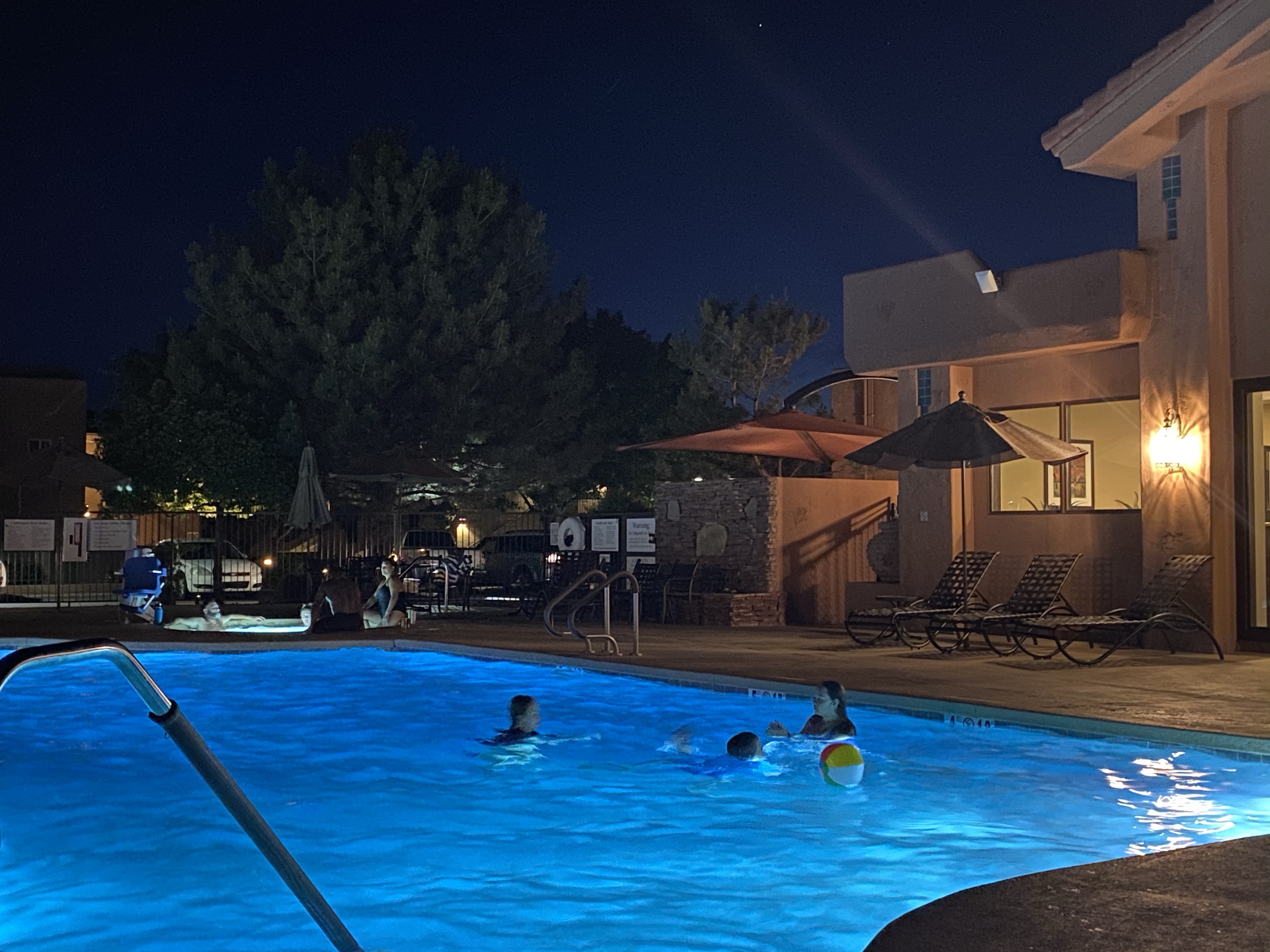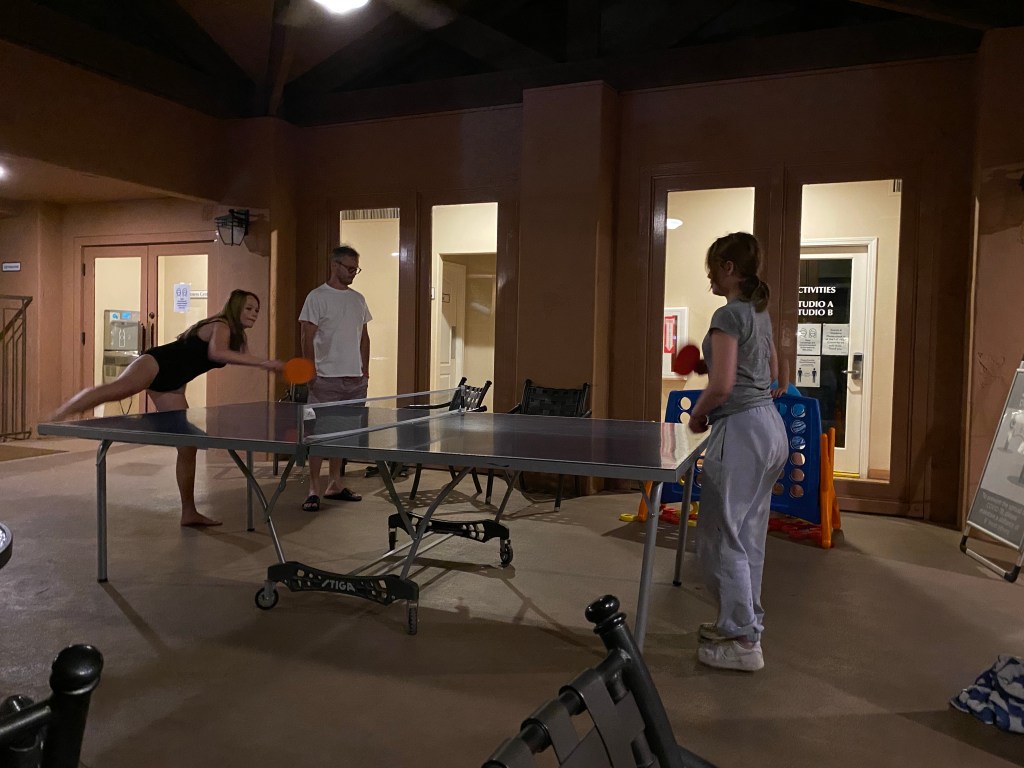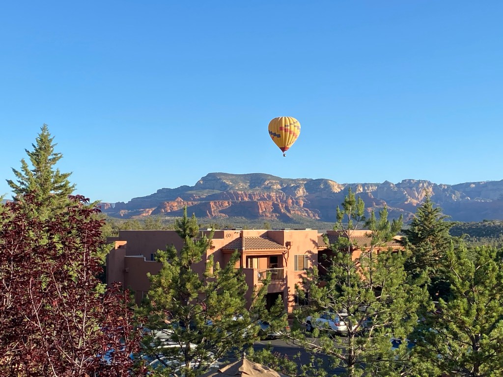 Not that we considered camping. We stayed at the Sedona Summit Resort, which gave us two rooms, big cushy beds, huge bathtubs, a kitchen, and two patio spaces with views of the red rocks of Sedona. Early morning brought views of hot air balloons drifting by. Best of all, we had four pools and four hot tubs from which to choose. Tatum and I lay on the hot cement by one pool, with our pale legs browning and talked deep talks; and all of us swam or jaccuzied under the stars in another pool area. The club house pool area gave us giant Connect Four, ping pong and table soccer, which we used multiple nights, when we weren’t playing Kids Against Maturity.