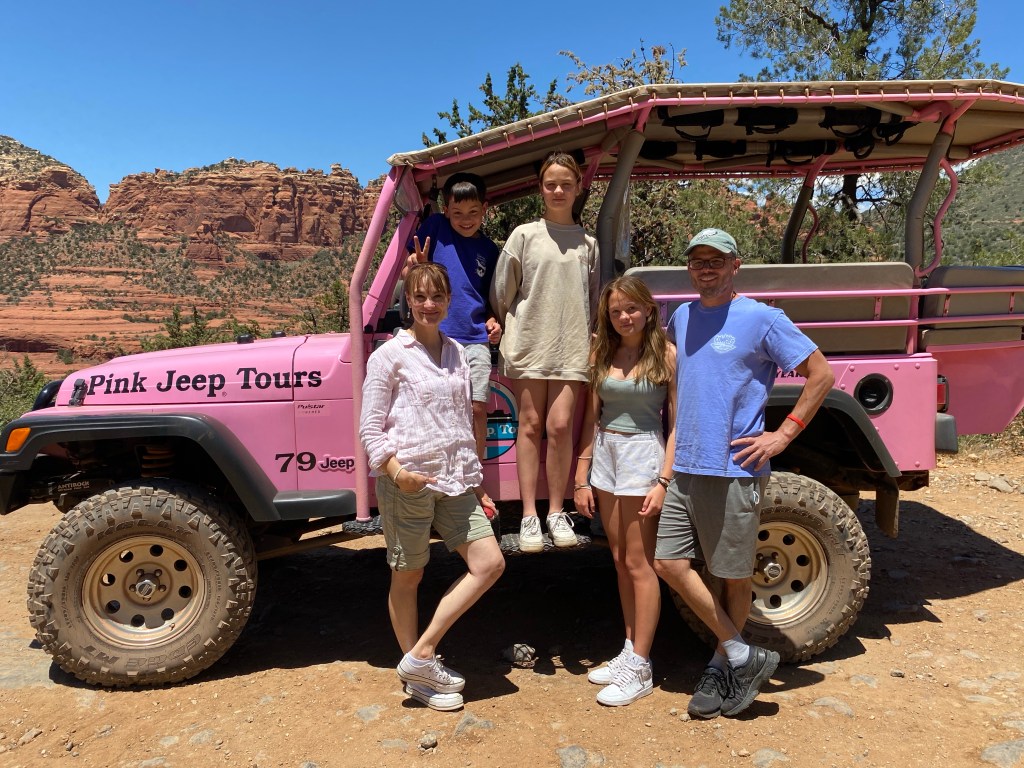 Pink, like frosted toe nails pink, also featured prominently on our trip. We took a Pink Jeep tour up into the cliffs our first day. Our guide Mike was a former history professor and I loved seeing the old wagon trails from 1901, places where miles had to be attached to the back of the wagons because the descent was so steep, places where it took four days to travel 45 miles from Sedona to Flagstaff, where the train could bring in supplies or carry out goods for sale. The road felt practically as bumpy now, but it was fascinating and fun to be up in the red cliffs, which were once where Namibia is now.