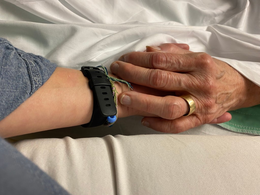Auntie Carol is such a presence. I love her hands, adorned with her wide gold wedding band and often a gold Irish ring and a pinkie ring on the other hand, and the way they moved so expressively and warmly. I held her hand in the hospital Friday evening and it warmed mine. Isn’t that the way with mothers? Even when you try to comfort them, they end up comforting you somehow.